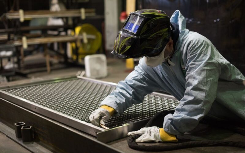 Nearby, welders O’Neil Guy and Stanley Punch laid out the frame of a barrier with squares, checking the angles and tapping the pieces into position, before Guy flipped down his welding mask and picked up a torch.