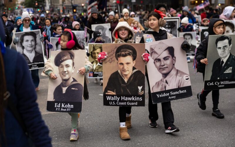 Thousands of people lined Fifth Avenue in Manhattan, New York, waving American flags for the 106th annual Veterans Day Parade on Tuesday, Nov. 11, 2025. The largest Veterans Day Parade in the nation honored this country’s heroes with former military members representing every military branch in a sea of red, white and blue.