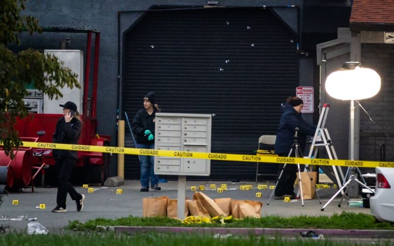 Investigators examine the scene of the mass shooting Sunday in Stockton, Calif. (AP Photo/Ethan Swope)