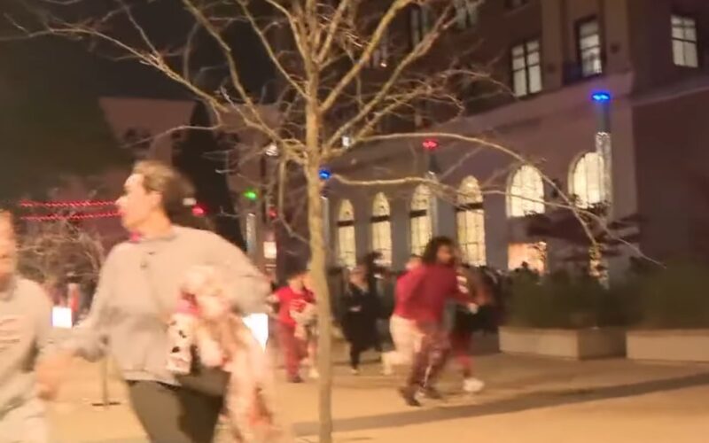 Video shared online sees festively dressed revelers fleeing through decorated streets, and away from the the city’s 28th annual tree lighting ceremony.