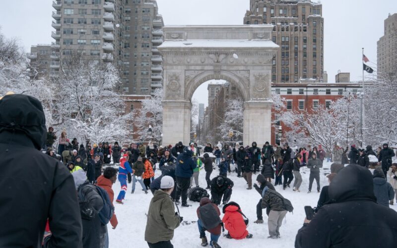 The pelting occurred amid a pre-planned snowball fight inside the West Village park following a blizzard that dumped nearly 20″ of snow in Central Park Sunday into Monday.