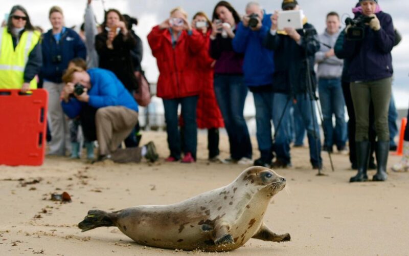 FILE – A hooded seal is released March 30, 2008, by the University of New England’s Marine Animal Rehabilitation Center in Biddeford, Maine. (AP Photo/Joel Page, File)