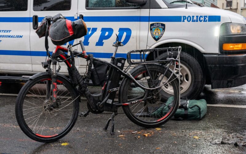Both the Lexus and the victim’s bicycle — along with a warming bag with two green pizza boxes inside — remained at the scene as the investigation into the crash continued.
