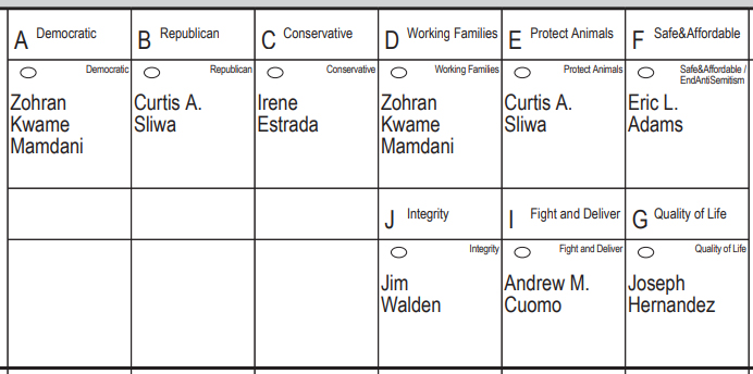 There are two problems which are apparent in looking at the ballots. One of them is that Democratic nominee Zohran Mamdani (on row A) is also listed as the candidate of the Working Families Party (on row D). He shouldn’t be. That spot should be blank.