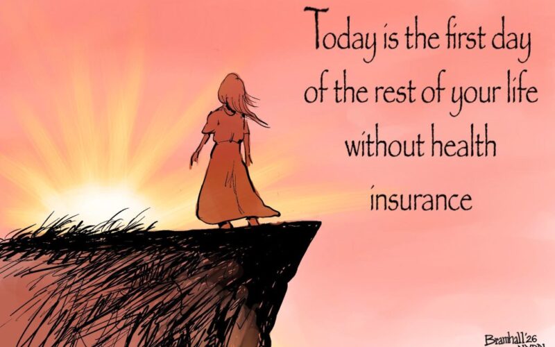 Bill Bramhall’s editorial cartoon for Monday, January 5, 2026. In the inspirational quote styling “Today is the first day of the rest of your life without health insurance” (Bill Bramhall / New York Daily News)