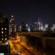 The four-bedroom, 3½-bath home opens from a private elevator landing into a formal foyer, leading to living and dining spaces framed by skyline panoramas.
