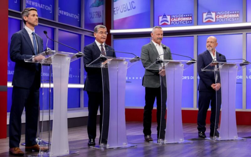 Matt Mahan, Xavier Becerra, Chad Bianco and Steve Hilton verbally jousted during Wednesday’s debate. AP