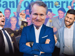The exterior of the Deutsche Bank Center in New York with people walking past it.