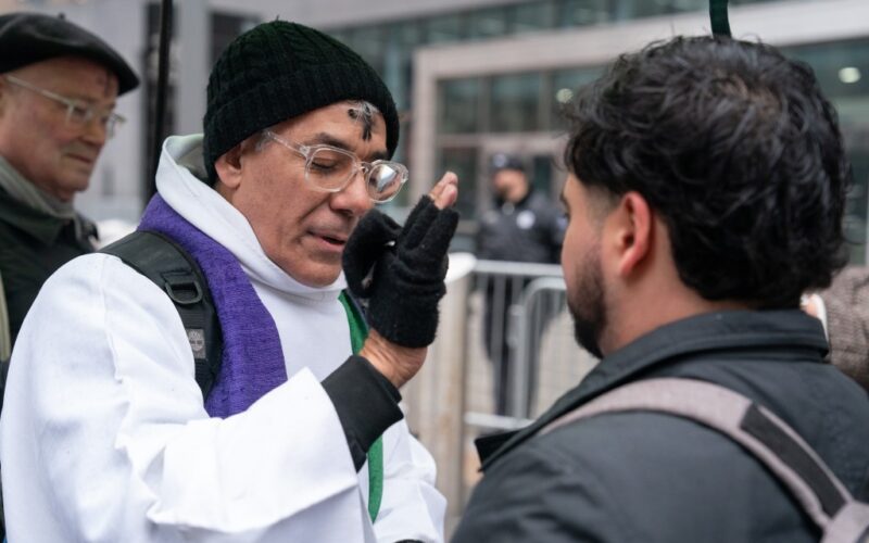 Father Fabian Arias gives out ashes outside the Jacob Javits Federal Building on Wednesday, Feb. 18, 2026, in Manhattan, New York.