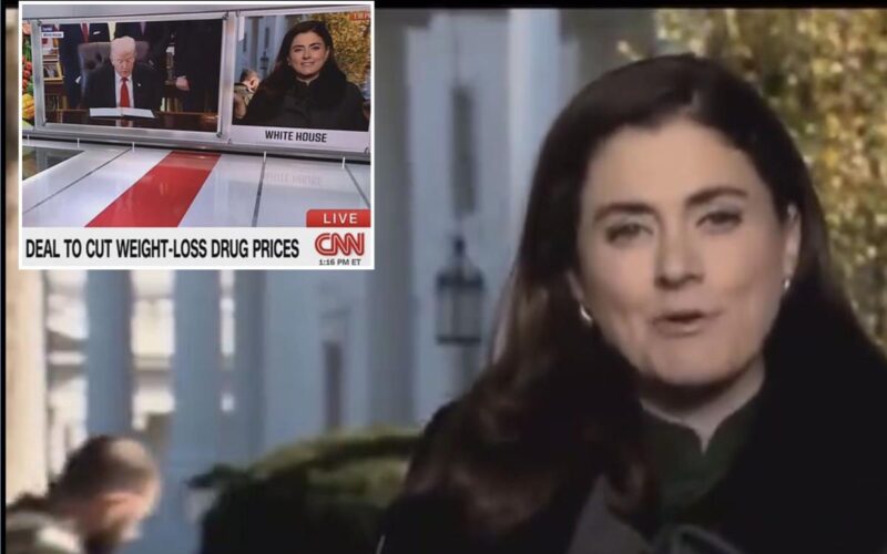 Senior White House Correspondent Kristen Holmes was midway through an update on newly announced pharmaceutical deals when the whirring of a leaf blower drowned out her voice during a segment that was first reported by DailyMail.com.
