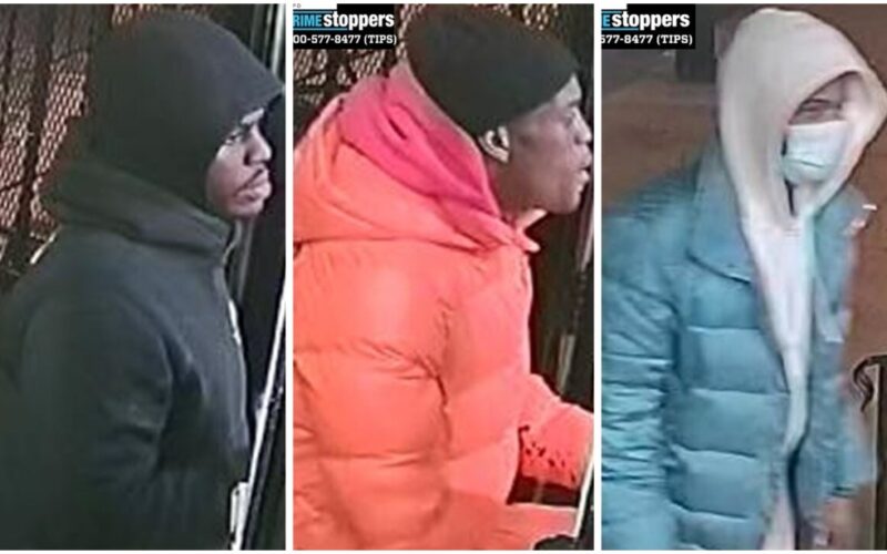 One of his accomplices was wearing a surgical mask, teal-colored jacket, light colored sweat suit and dark colored sneakers. A third suspect was wearing a black knit cap, orange jacket with black writing on the back, a red sweatshirt, and dark colored pants and white sneakers.