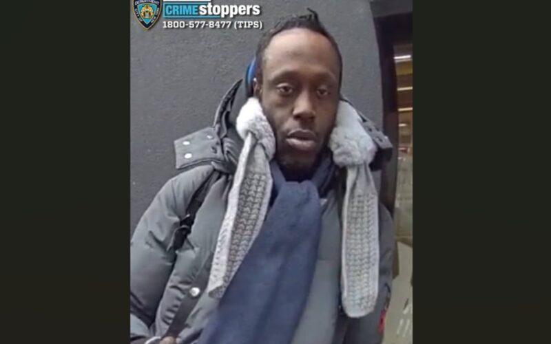 The man the NYPD is looking for wore a dark-colored sweater with white lettering on the front, multicolored pants, gray sneakers, a black backpack and a blue medical mask.