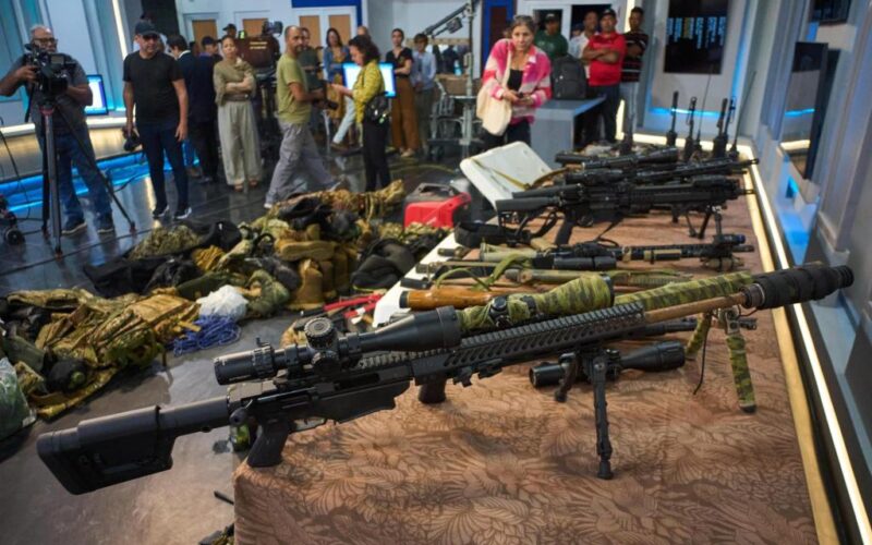 The government unveiled items said to have been found on the boat, including a dozen high-powered weapons, more than 12,800 pieces of ammunition and 11 pistols.