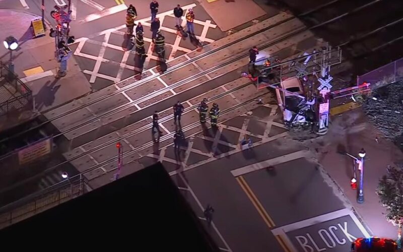 Footage captured by a CBS News helicopter shows a white car with severe damage to both its front and rear ends, while the train appeared unscathed.