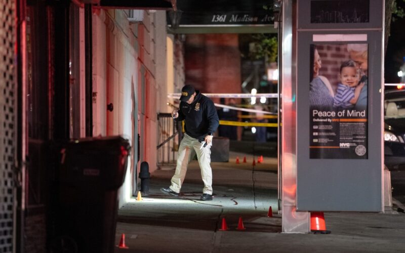 NYPD officers and detectives investigate a police involved shooting on Madison Ave. between E. 95th St. and E. 96th St. Thursday, Nov. 13, 2025. A gun was recovered at the scene (inset). (Barry Williams/ New York Daily News)