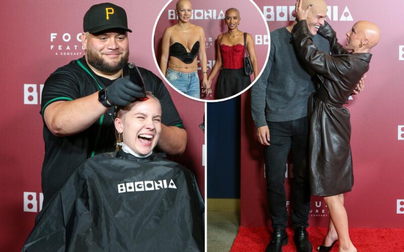 Dozens of daring moviegoers lined up to get their heads shaved for admission into an early screening of the film “Bugonia” in Los Angeles — an homage to the bald main character played by actress Emma Stone.