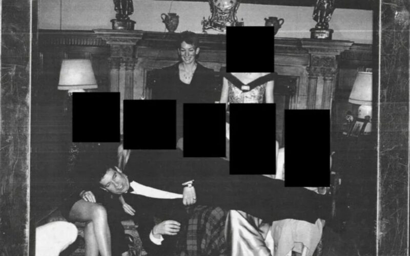 The undated picture features six women, whose faces are blacked out, and Jeffrey Epstein’s smiling madam, Ghislaine Maxwell, looking down at the disgraced royal.