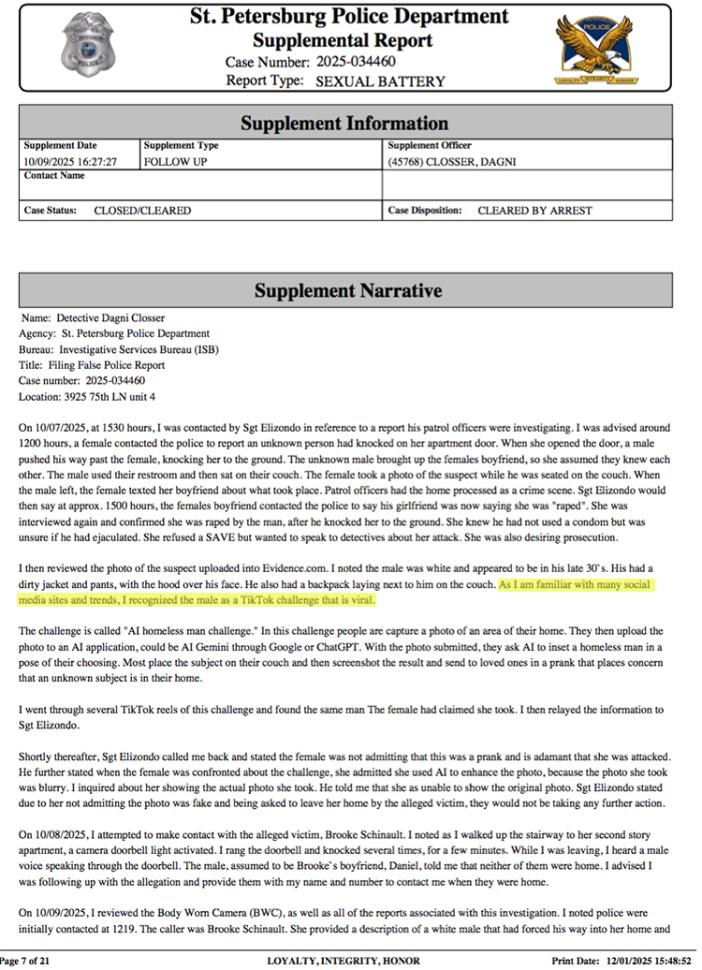 “As I am familiar with many social media sites and trends, I recognized the male as a TikTok challenge that is viral … called ‘AI Homeless Man’ challenge,’” Det. Dagni Closser wrote in the police report. “I went through several TikTok reels of this challenge and found [photos of] the same man the female claimed she took.”