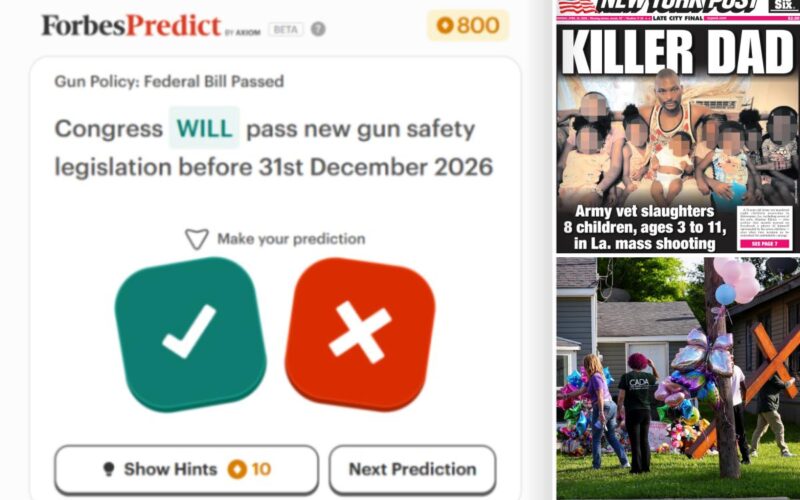 Embedded in the article was a “ForbesPredict” box asking: “Congress WILL/ WON’T pass new gun safety legislation before 31st December 2026?”
