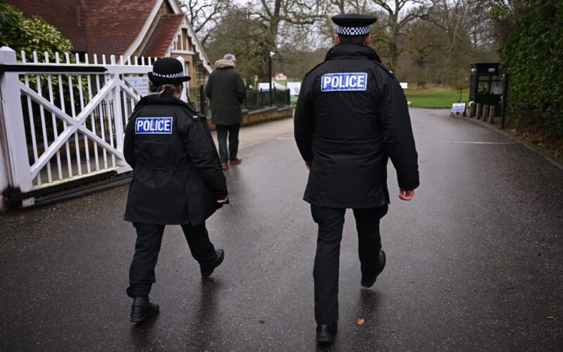 Police officers stand guard as the media report in the foreground near the entrance to Wood Farm, the home of Andrew Mountbatten-Windsor, on Feb. 19, 2026, in Sandringham, Norfolk.