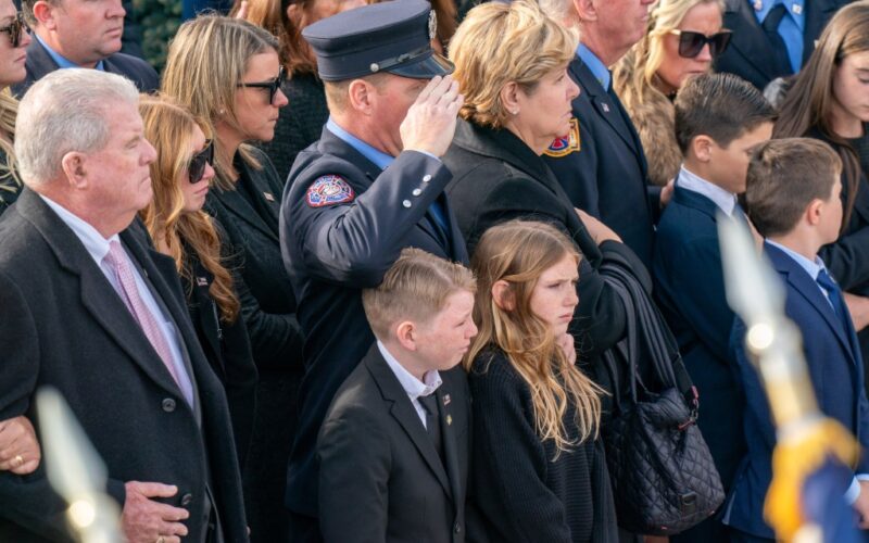 Dennis Brady, father of the deceased, is seen at left, during fallen firefighter Patrick Brady’s funeral in Queens on Saturday, Nov. 15, 2025.