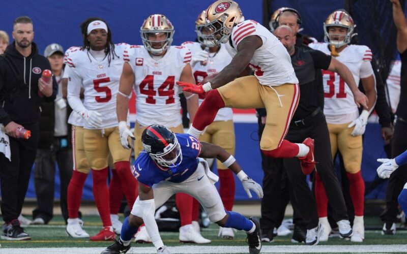 Jones and the Niners, meanwhile, answered Dart’s opening game touchdown immediately with a 12-play, 68-yard drive and a 5-yard Jones touchdown pass to McCaffrey.