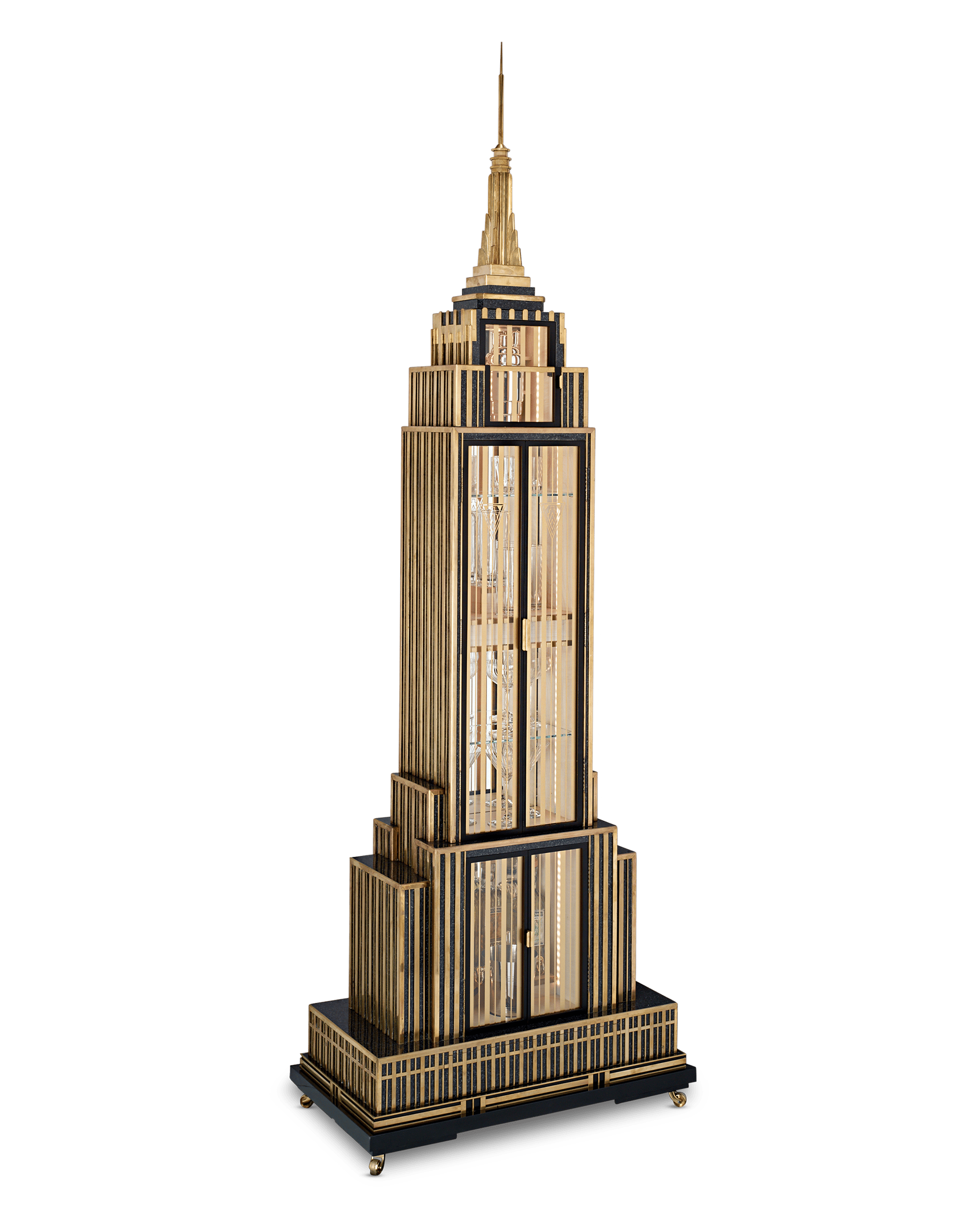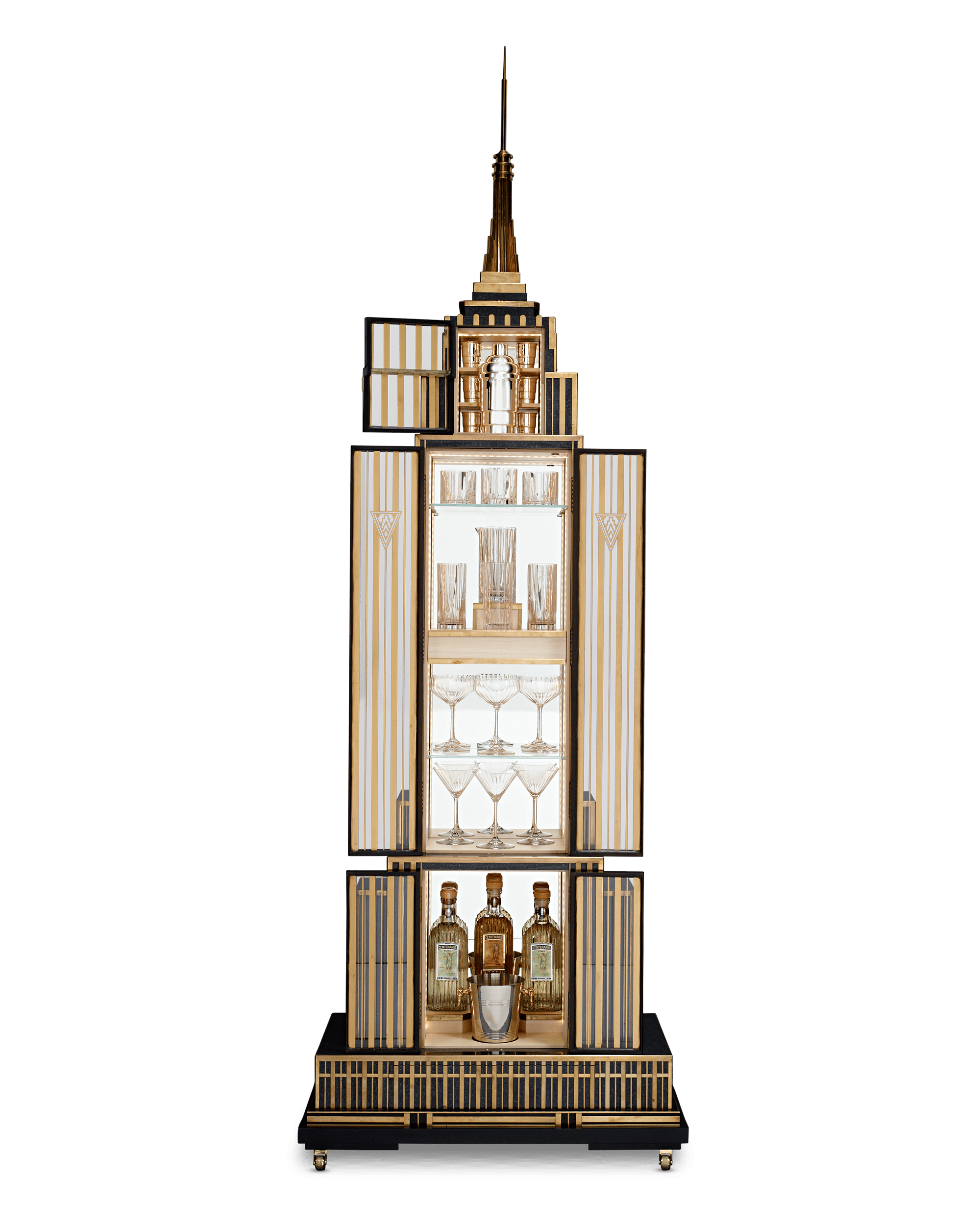 The liquor cabinet opens to reveal illuminated tiers of glass shelves with martini glasses, a silver shaker and an ice bucket. The Art Deco piece mirrors the classic lines of the 1931 building that inspired it.