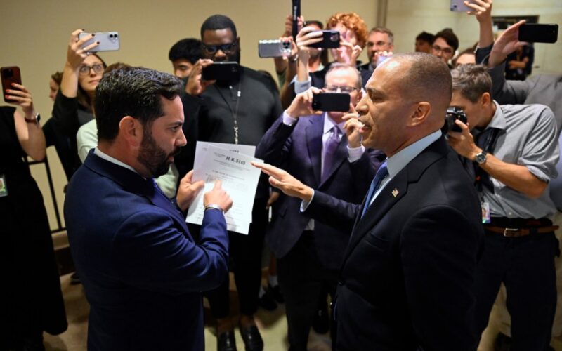 Rep. Michael Lawler, R-N.Y., left, confronts House Minority Leader Hakeem Jeffries, D-N.Y., in a heated discussion to endorse House bill H.R.5145 that would extend the American Rescue Plan Act of 2021 and the Inflation Reduction Act of 2022 at the U.S. Capitol on Wednesday, Oct. 8, 2025, in Washington. (AP Photo/John McDonnell)