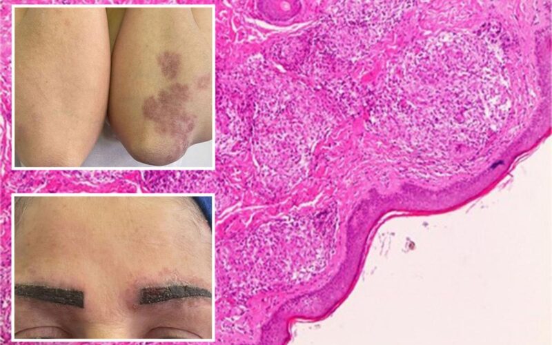 Approximately 15 months after getting her eyebrows tattooed, an unidentified 46-year-old woman sought dermatological care for patches of purplish lesions that appeared around her eyebrows and later on non-tattooed areas, including her elbow and upper back.