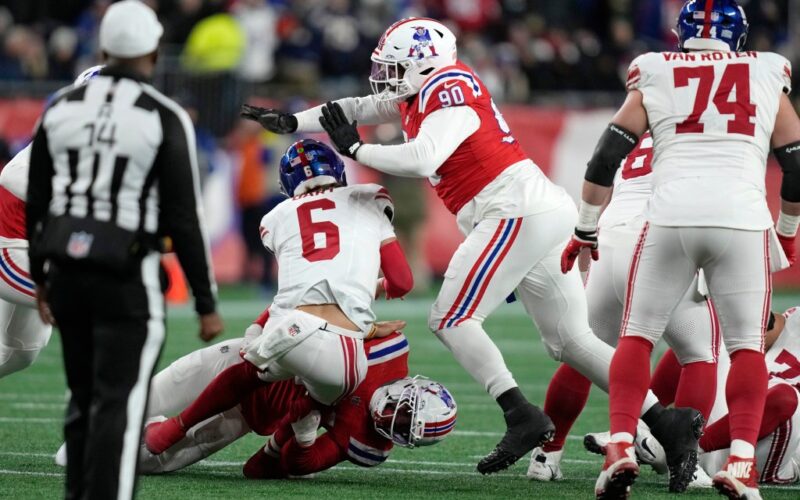 Rookie quarterback Jaxson Dart, in his first game back from a concussion, got blasted into another dimension on an early scramble toward the sideline by Patriots linebacker Christian Elliss.