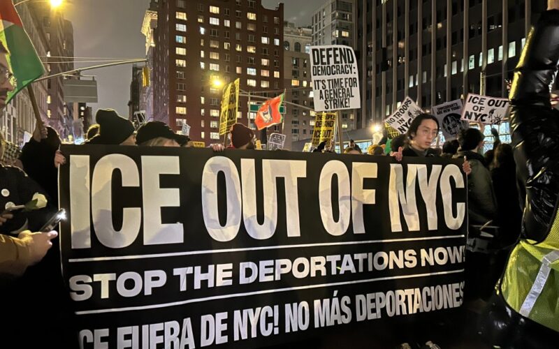 The crowd chanted “We want ICE off our streets,” “No Justice no peace“ and “ No ICE, no KKK, no fascist USA” as protesters marched around Foley Square and streets surrounding the nearby US Immigration and Customs Enforcement building at 26 Federal Plaza.
