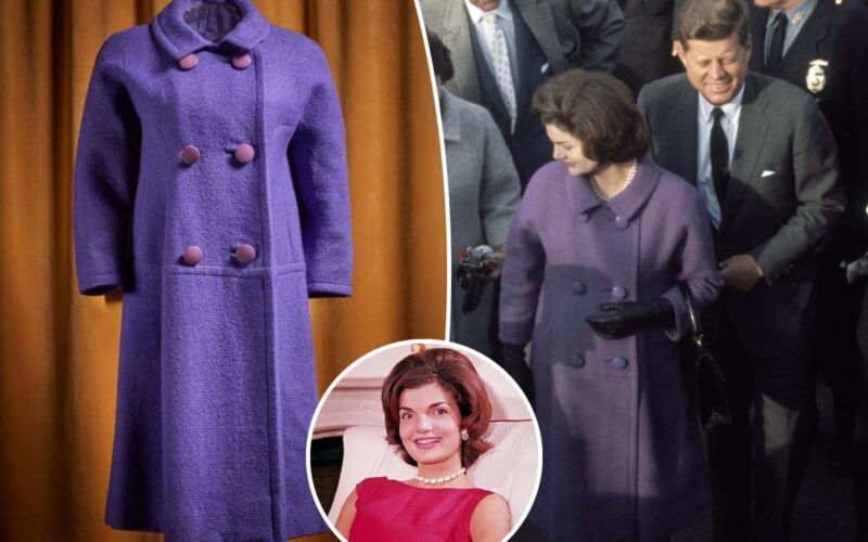 It’s the violet-colored maternity coat she wore while eight months pregnant, as her husband was announced as the next American president on Nov. 8, 1960.
