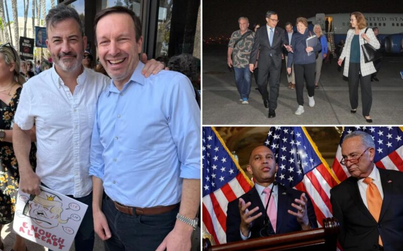 Over the weekend, Sen. Chris Murphy (D-Conn.) posted a picture of himself posing next to late-night comedian Jimmy Kimmel in Los Angeles — far away from his home state — while participating in a “No Kings” rally.