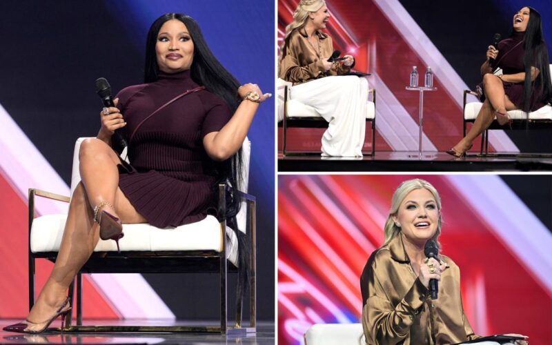 Rapper Nicki Minaj made a surprise appearance with Erika Kirk at AmericaFest Sunday, where she took questions from Charlie Kirk’s window and urged young men to be like “handsome, dashing” President Trump — while ripping California Gov. Gavin “Newscum.”