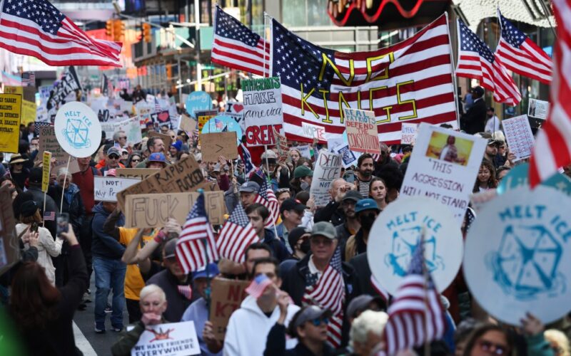 Thousands of people participate in a “No Kings” protest in Manhattan on Oct. 18, 2025, in New York City. Organizers expect millions to participate in cities and towns across the nation for the second “No Kings” protest to denounce the Trump administration.