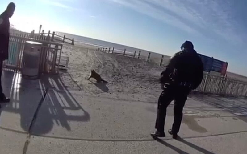 Bodycam video obtained by the Daily News shows three cops approached the animal as it moved near a fence from the beach toward the boardwalk near Beach 121st St. in Rockaway Park Thursday morning.