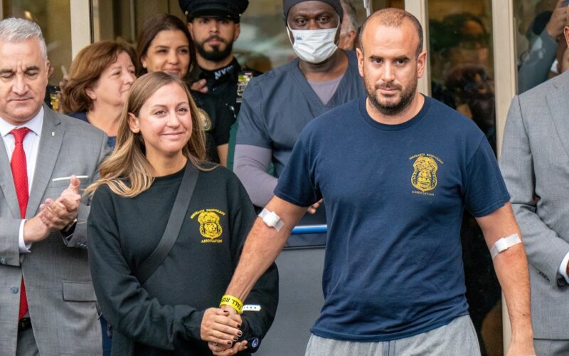 Sgt. Nicholas Novak humbly accepted the applause from the line of NYPD well-wishers as he left Jacobi Hospital, with his pregnant wife by his side.