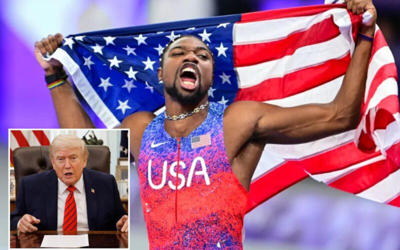 Noah Lyles celebrates after winning the men’s 100m final of the athletics event at the Paris 2024 Olympic Games at Stade de France in Saint-Denis, north of Paris, on August 4, 2024. Anadolu via Getty Images