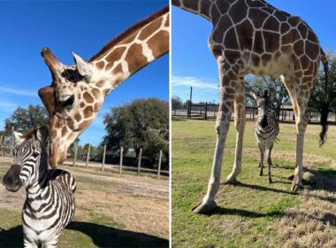A zebra and giraffe form an unlikely friendship that’s melting hearts