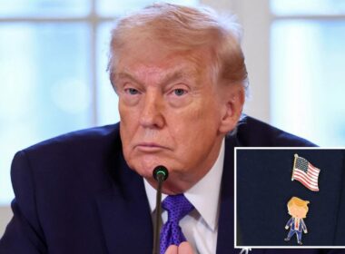 President Trump wears ‘Happy Trump’ lapel pin of himself for oil magnate meeting