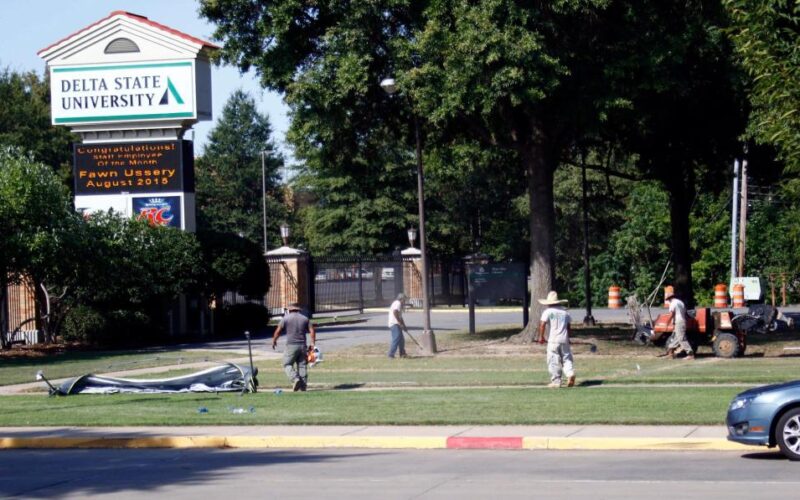 FILE – Students sit on a bench in front of Kent Wyatt Hall on Delta State University’s Cleveland, Miss., campus on Sept. 14, 2015. (AP Photo/Rogelio V. Solis, File)