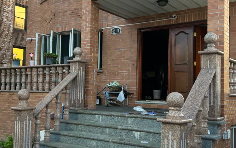 Police at the scene where police say a 27-year-old man stabbed his 50-year-old mother-in-law to death before turning the knife on a 17-year-old and himself inside a home on Smart St. in Flushing, Queens on October 2, 2025. (Kerry Burke/NYDN)
