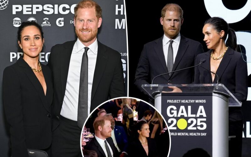 Prince Harry and Meghan Markle speak onstage after accepting the Humanitarian of the Year award at the Project Healthy Minds Gala in New York City on Oct. 9, 2025. Getty Images for Project Healthy Minds