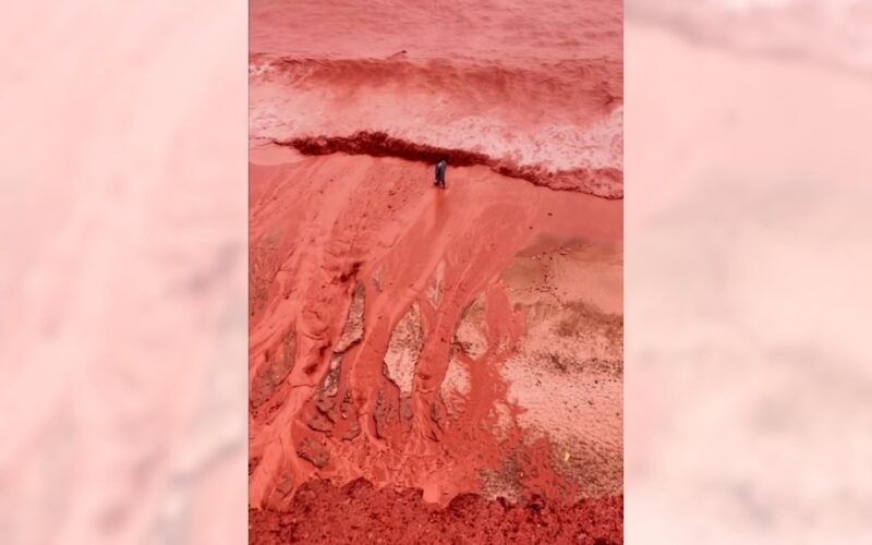 TEHRAN, Iran (AP) — Rainfall on Iran’s Hormuz Island briefly transformed the coastline of its famed Red Beach into a striking natural scene this week, as red soil flowed into the sea and turned the water shades of deep red.