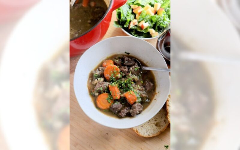 Be sure not to splurge on the wine for the stew — any good-quality inexpensive dry red wine will work in this dish. I used pinot noir, but cabernet sauvignon or merlot will also work even though they are not burgundies.