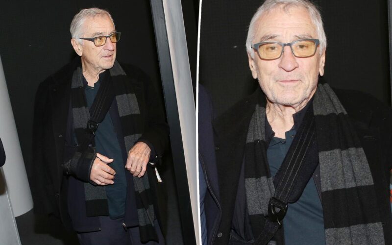 The “Goodfellas” star, 82, was photographed with his right arm in a sling while attending a Broadway performance of “Oedipus” at Studio 54 in New York City on Wednesday.