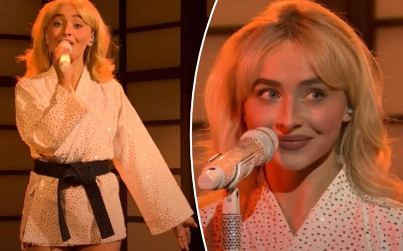 Carpenter sang “Nobody’s Son” in a martial-arts setting while wearing a white bejeweled karate gi. Earlier in the episode, she performed “Manchild,” the lead single from her latest album.