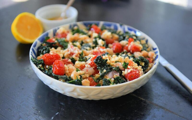 Waiting for the sorghum to finish cooking — it takes about an hour — is the hardest thing about this nutritious vegetarian salad. I used grape tomatoes and lacinato (Tuscan) kale, but you could add any favorite green or veggie. Consider doubling the dressing if you prefer a really moist grain salad.