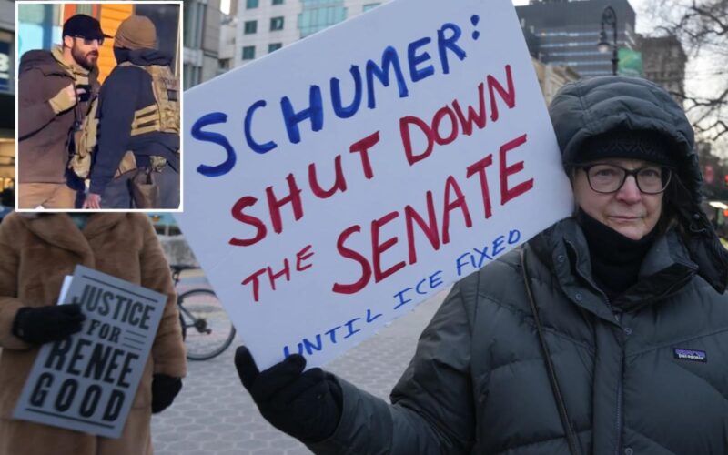 A protester holds a sign calling for Sen. Schumer to shut down the Senate during a protest in New York City on Jan. 24, 2026. ZUMAPRESS.com