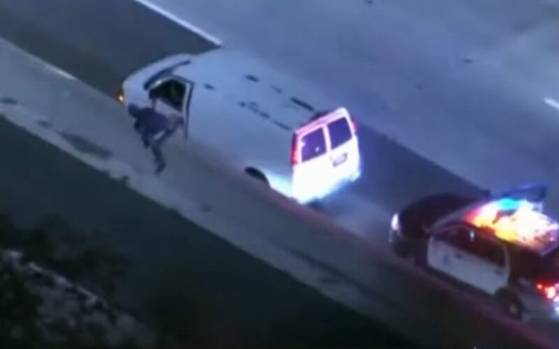 The van’s driver then crawled out of his vehicle’s window, crossed over a median and was instantly struck by a car speeding in the opposite direction, which was broadcast by the news helicopter following the chase.